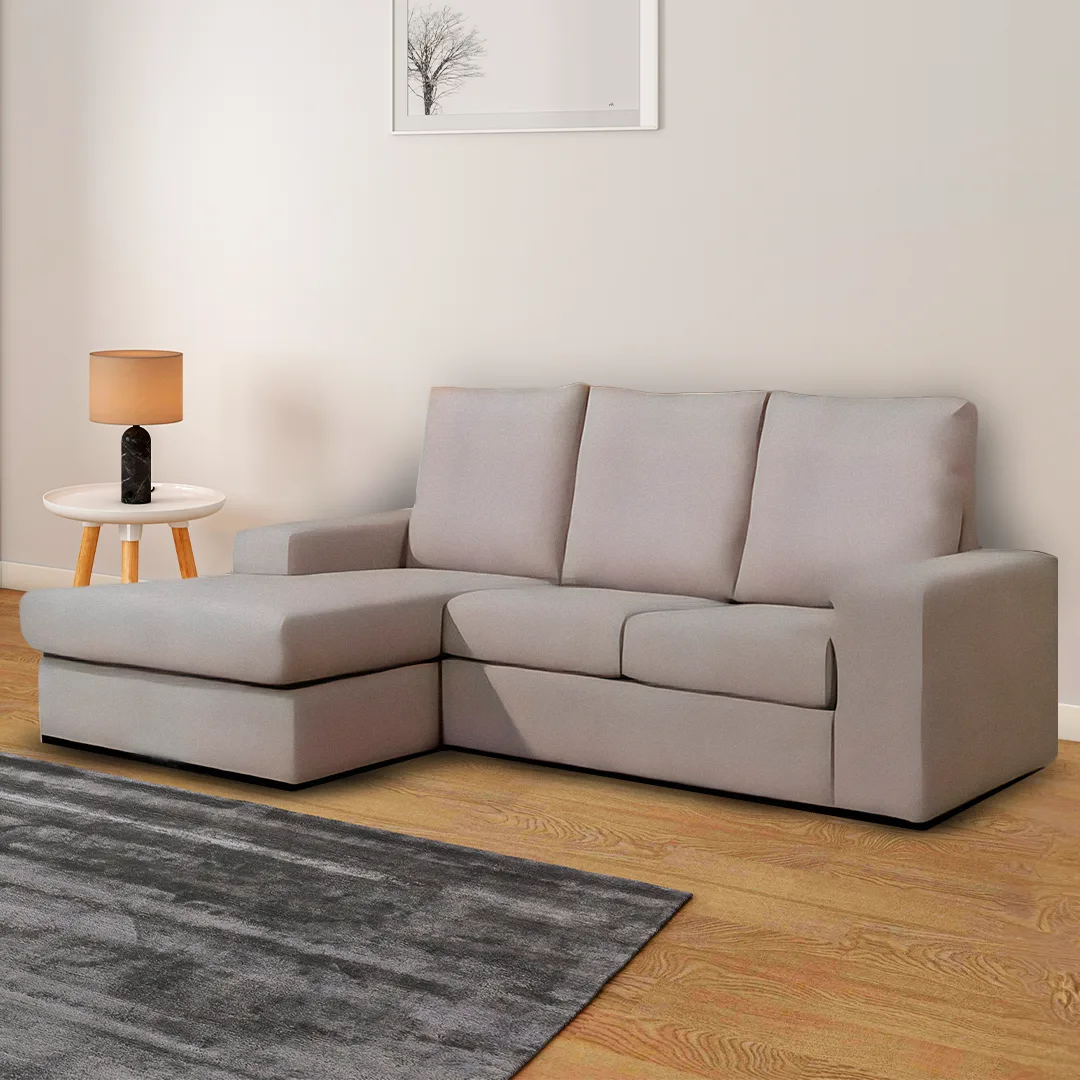 Sofá barato com chaise reversível (190×140 cm). Disponível em preto, cinza e bege.