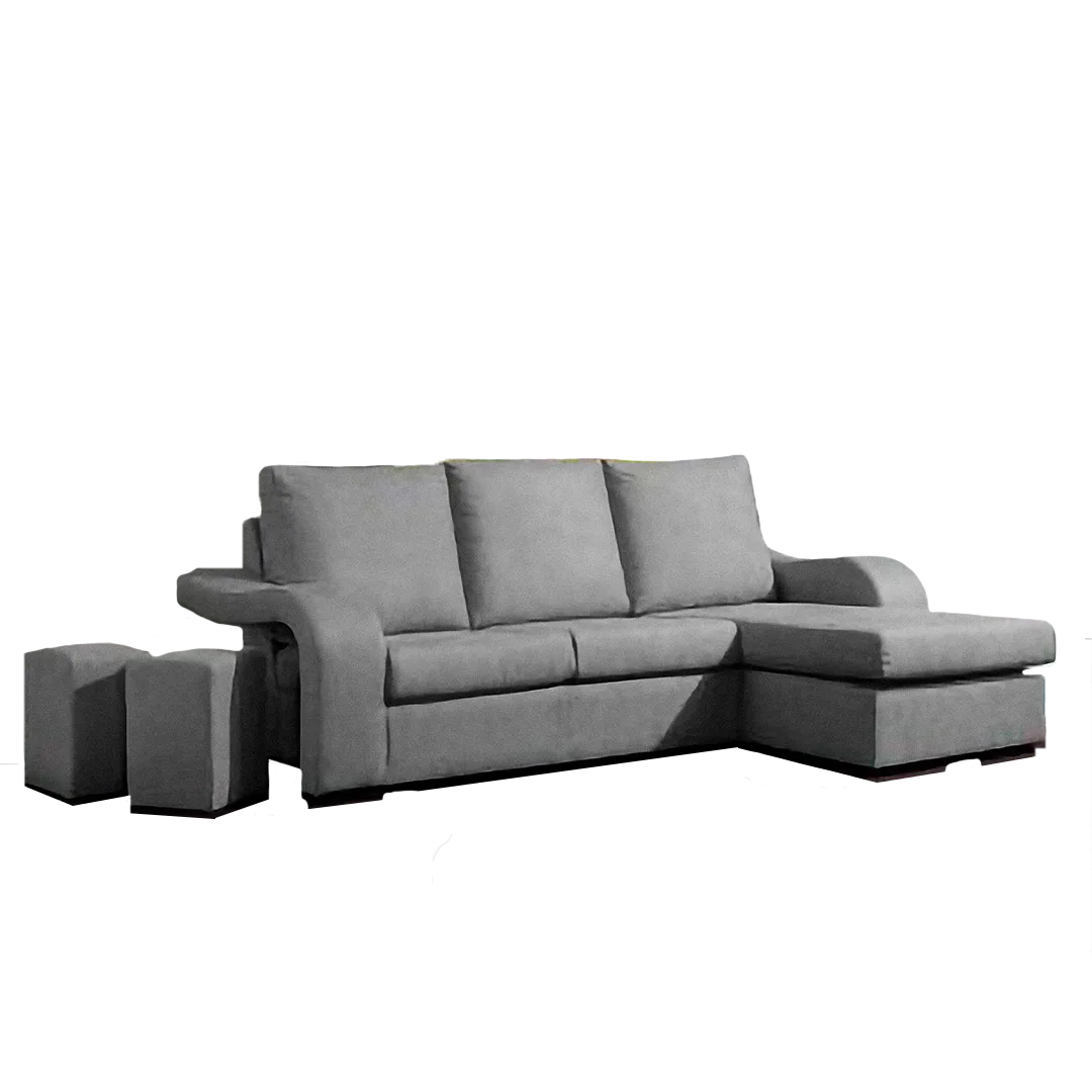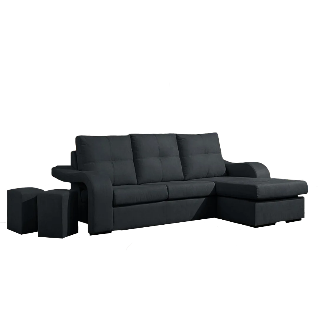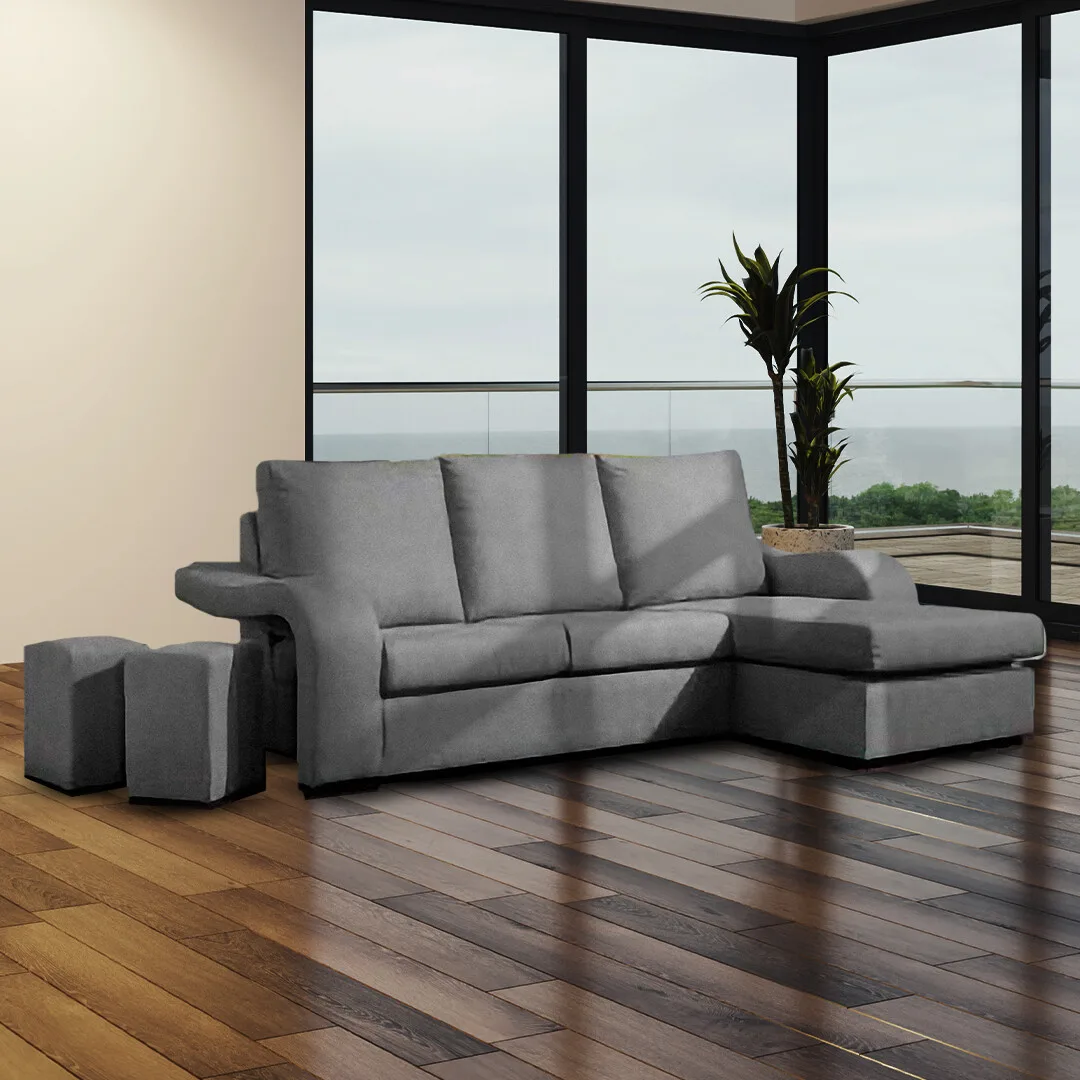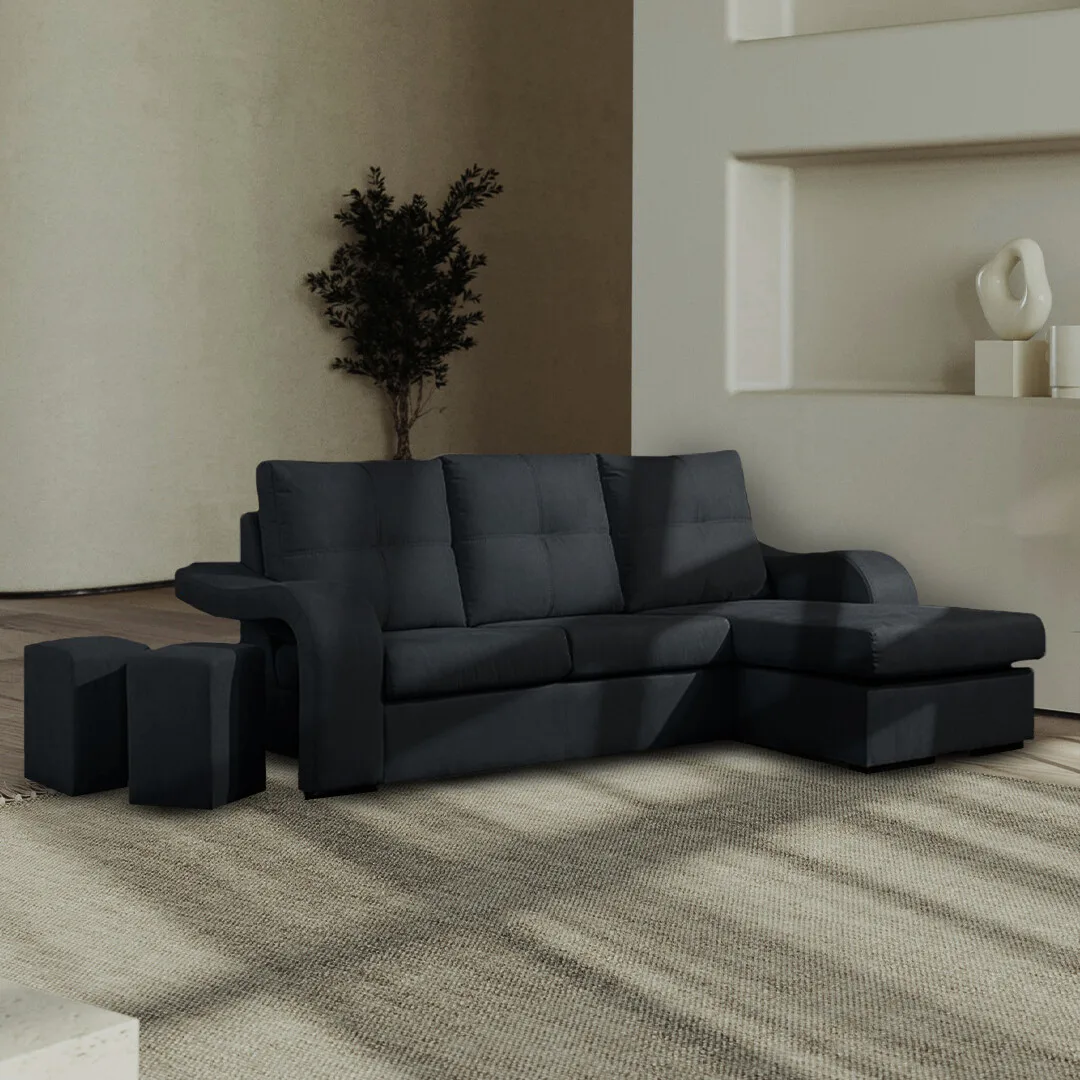 Sofá moderno com chaise longue reversível e 2 poufes integrados. Disponível em preto, cinza e bege.