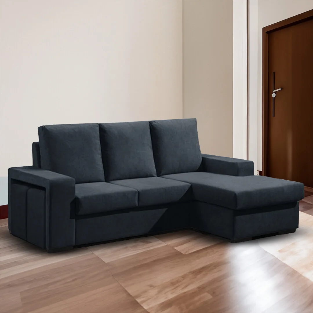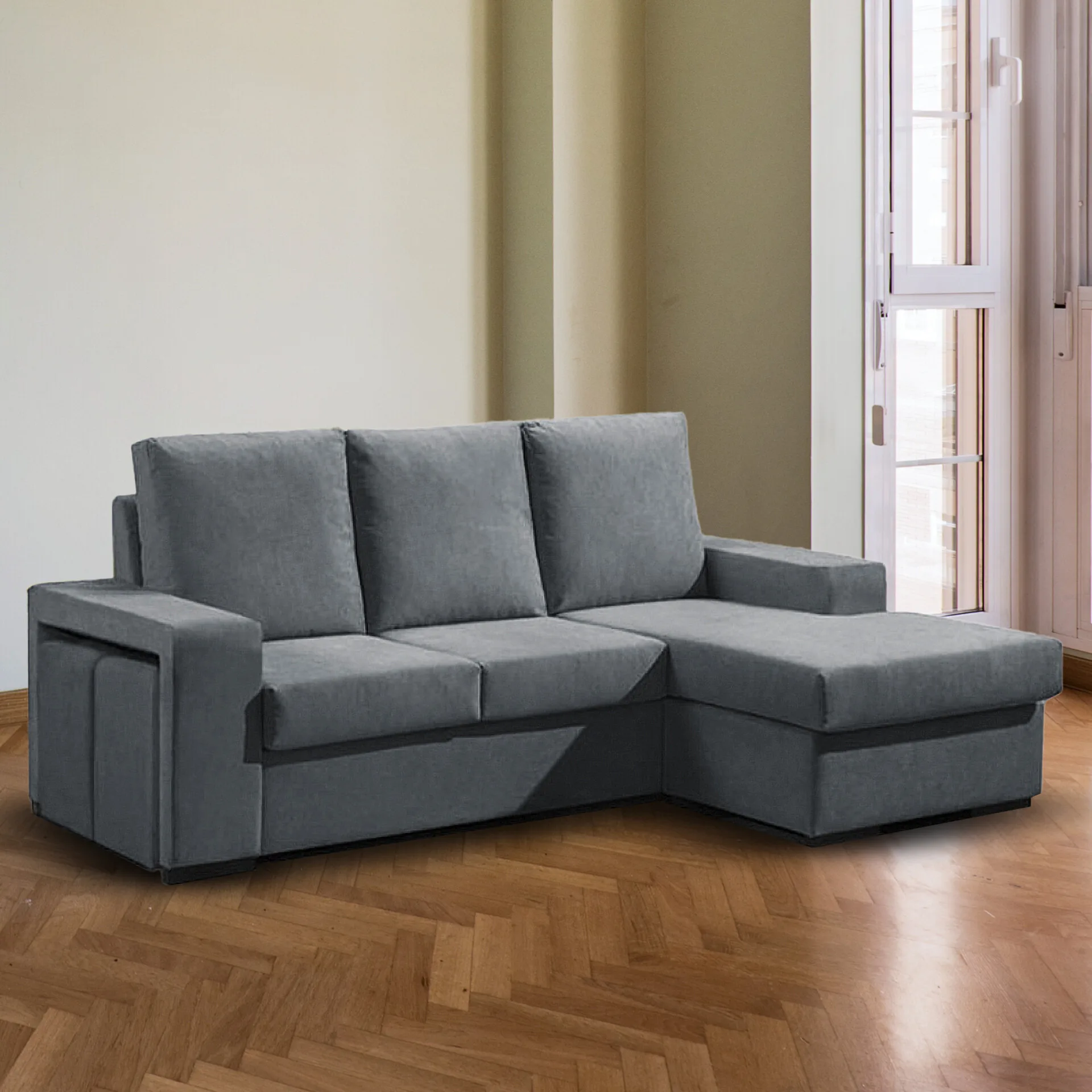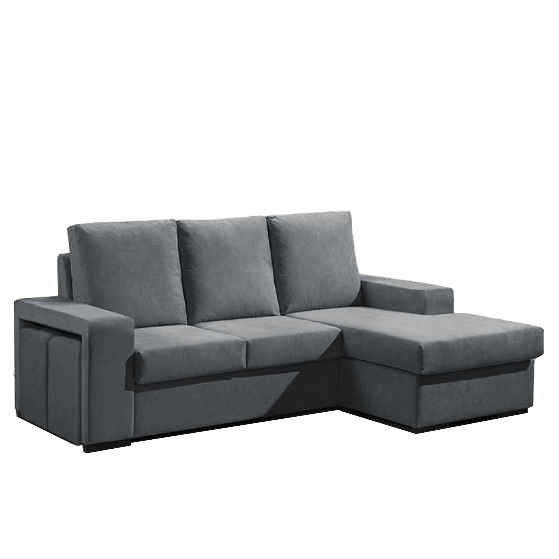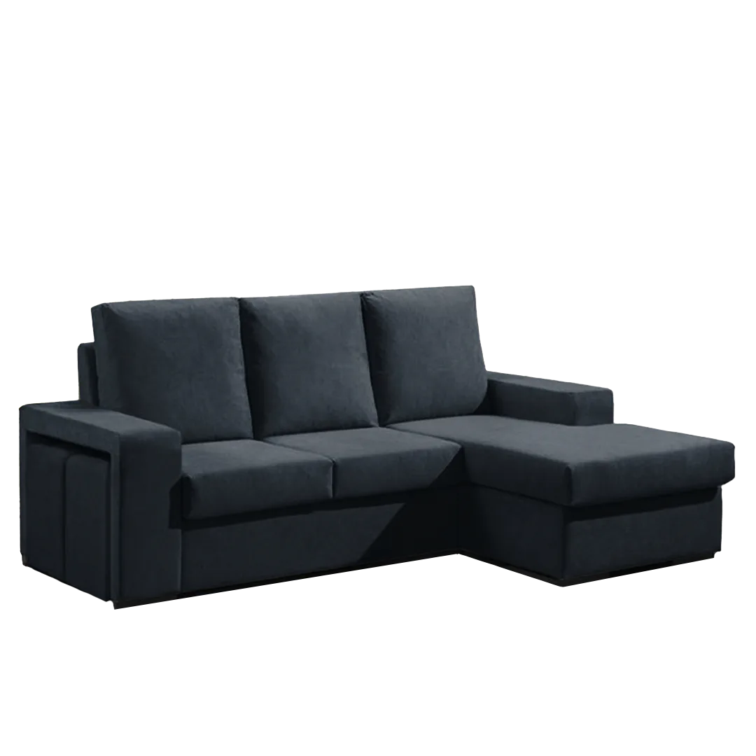 Sofá moderno com chaise longue reversível e arrumação integrada. Disponível em preto e cinza.