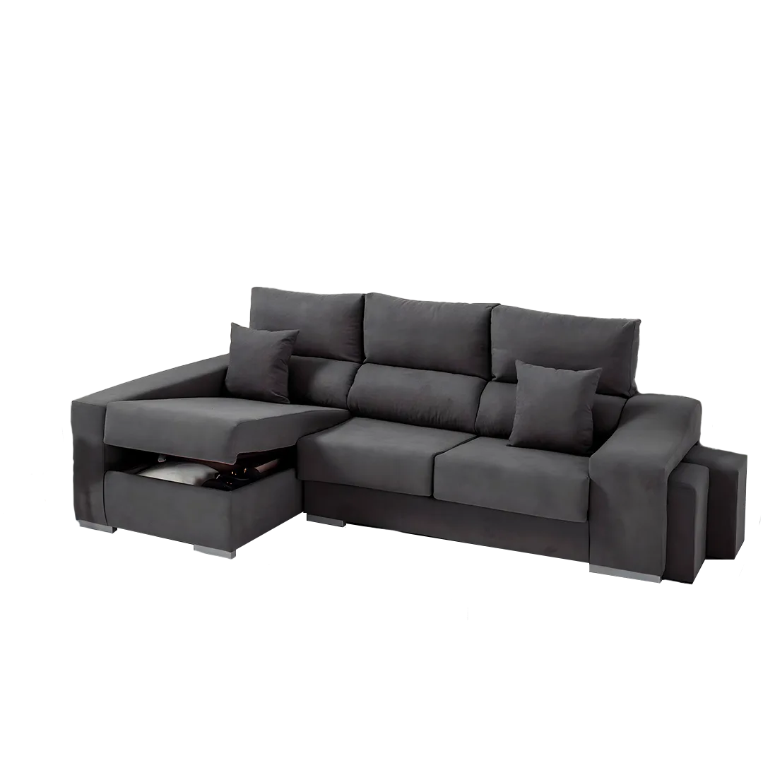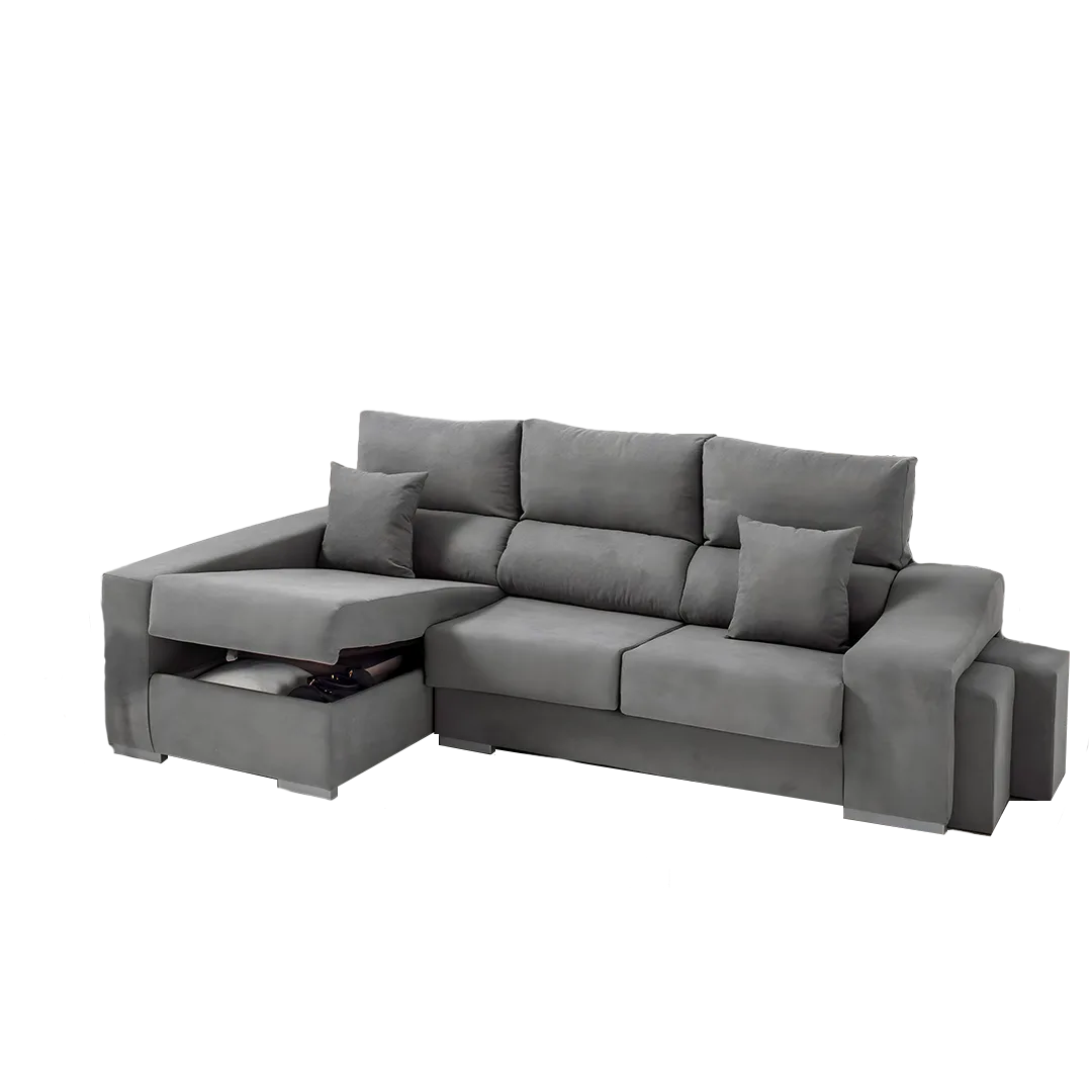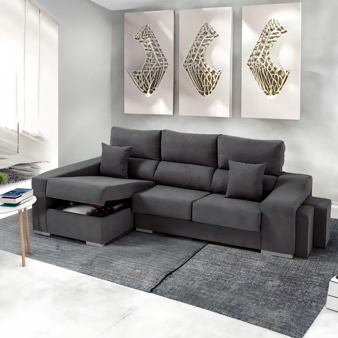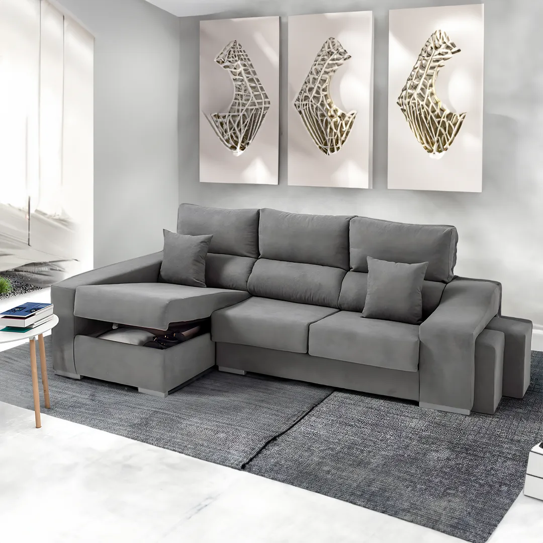 Sofá moderno com chaise reversível e arrumação. Assentos extensíveis e encostos reclináveis.